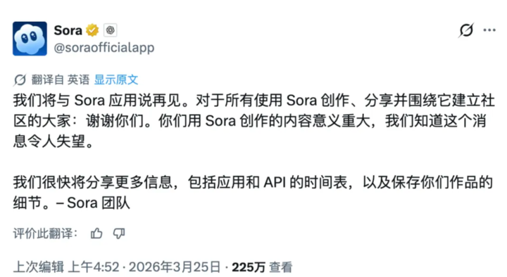 就在刚刚,Sora 官方也在 X 平台上发文告别: