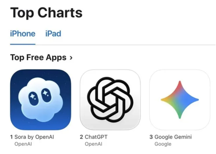 排场拉满了,市场反响也是真实的。Sora 上线不到五天,下载量就突破了 100 万,一度冲上苹果 App Store 榜首。开局阶段,用 Sora 生成《海绵宝宝》《皮卡丘》等知名 IP 视频的创作者们引发了一阵狂欢。
